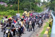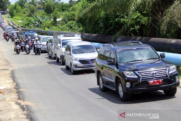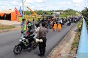 Sejumlah pengguna jalan mengantre saat melintas di pos penyekatan larangan mudik di Dumai, Riau, Sabtu (15/5/2021). ANTARA FOTO/Aswaddy Hamid/aww.