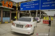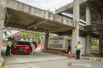 Petugas melakukan penyekatan kendaraan di Rest Area KM 149 Tol Cileunyi, Kabupaten Bandung, Jawa Barat, Minggu (16/5/2021). Penyekatan dan pemeriksaan tersebut dilakukan terhadap pengendara berplat nomor luar Bandung yang menuju ke Bandung atau Jabodetabek guna mengantisipasi lonjakan kasus COVID-19 saat arus balik Lebaran Idul Fitri 1442 Hijriah. ANTARA FOTO/Novrian Arbi/rwa.