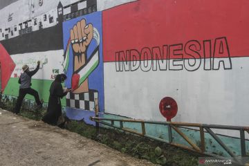 Remaja menyelesaikan pembuatan mural bertema Solidaritas untuk Palestina di Gang Jambu, Kedaung, Depok, Jawa Barat, Selasa (18/5/2021). Remaja Majelis Al Muntaqilin membuat mural tersebut sebagai aksi solidaritas serta doa bagi warga muslim Palestina dan Masjid Al Aqsa terhadap serangan pasukan Israel. ANTARA FOTO/Asprilla Dwi Adha/wsj.