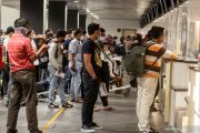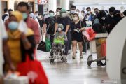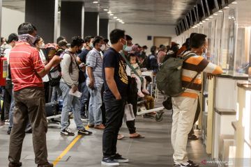 Calon penumpang mengantre di loket lapor diri Bandara Internasional Juanda Surabaya di Sidoarjo, Jawa Timur, Selasa (18/5/2021). Berakhirnya pemberlakuan larangan mudik Hari Raya Idul Fitri 1442 Hijriah pada 17 Mei 2021, aktivitas di Bandara Juanda terpantau ramai dengan jumlah penumpang sekitar 2.100 orang. ANTARA FOTO/Umarul Faruq/wsj.
