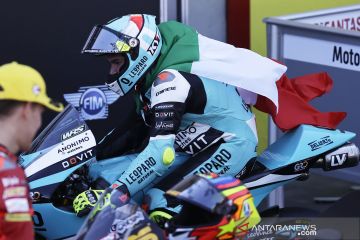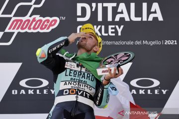 Pembalap tim Leopard Racing Dennis Foggia merayakan kemenangan usai menjadi juara pertama balapan Moto3 GP Italia di Sirkuit Mugello, Scarperia e San Piero, (30/5/2021). ANTARA FOTO/ REUTERS/Ciro De Luca/aww.