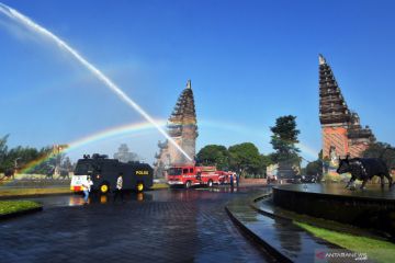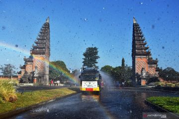 Petugas kepolisian dan Penanggulangan Bencana Daerah (BPBD) Kabupaten Badung menyemprotkan cairan Eco Enzyme dalam memperingati Hari Lingkungan Hidup Sedunia di kawasan Pusat Pemerintahan (Puspem) Kabupaten Badung, Bali, Sabtu (5/6/2021). Penyemprotan cairan Eco Enzyme yang merupakan disinfektan organik berbahan sampah sayur dan buah-buahan yang difermentasi tersebut digelar secara serentak di Kabupaten/Kota se-Bali untuk membantu memulihkan ekosistem supaya udara menjadi bersih dan sehat serta dapat menekan angka penularan COVID-19. ANTARA FOTO/Nyoman Hendra Wibowo/hp.