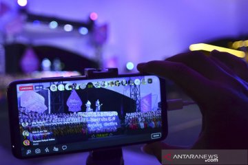 Warga menyaksikan pementasan Wayang Golek menggunakan telepon pintar yang dimainkan oleh Dalang Rian Nugraha Tresna Sunagar pada rangkaian acara yang dilaksanakan secara daring di Halaman Kantor Tourist Information Center ( TIC) Kabupaten Ciamis, Jawa Barat, Sabtu (12/6/2021) malam. Peringatan hari jadi Kabupaten Ciamis ke-379 itu dilangsungkan secara virtual untuk mengantisipasi penyebaran COVID-19 karena Ciamis masuk dalam status zona merah COVID-19 .ANTARA FOTO/Adeng Bustomi/aww.