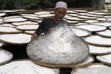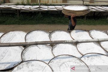 Pekerja menjemur tepung aci di Sukaraja, Kabupaten Bogor, Jawa Barat, Kamis (17/6/2021). Pemerintah mengklaim hasil pelaksanaan program Pemulihan Ekonomi Nasional (PEN) klaster dukungan UMKM membantu mayoritas penerima manfaat dapat bertahan selama pandemi COVID-19. ANTARA FOTO/Yulius Satria Wijaya/pras.