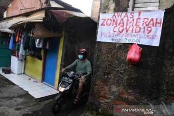 Warga berkendara di zona merah COVID-19 RT 006 RW 01, Gandaria Selatan, Cilandak, Jakarta Selatan, Senin (21/6/2021). Satgas Penanganan COVID-19 melaporkan kasus konfirmasi positif hingga Senin (21/6/2021) pukul 12.00 WIB bertambah 14.536 kasus sehingga total seluruhnya menjadi 2.004.445 kasus. ANTARA FOTO/Sigid Kurniawan/rwa.