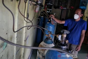 Penjual oksigen isi ulang mengecek tabung oksigen yang kosong di Jl Kusbini, Klitren, Yogyakarta, Rabu (23/6/2021). Pedagang mengaku oksigen isi ulang mulai langka sejak Senin (21/6) menyusul tidak adanya pasokan dari distributor pasca melonjaknya kasus COVID-19 di Yogyakarta. ANTARA FOTO/Andreas Fitri Atmoko/foc.