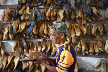 Pekerja membuat sepatu untuk memenuhi permintaan pasar domestik dan ekspor di rumah produksi Waris Shoes, Polehan, Malang, Jawa Timur, Senin (28/6/2021). Asosiasi Persepatuan Indonesia (Aprisindo) menargetkan nilai ekspor alas kaki nasional pada tahun 2021 dapat tumbuh 10 persen yakni mencapai 5,28 miliar dolar Amerika Serikat atau setara Rp76,22 triliun mengingat permintaan ekspor masih terus meningkat. ANTARA FOTO/Ari Bowo Sucipto/wsj.