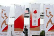 Seorang petugas berdiri di antara umbul umbul acara penyalaan obor, setelah estafet di jalan umum dibatalkan karena pandemi coronavirus (COVID-19), dalam acara estafet obor Olimpiade Tokyo 2020, di Yokohama , Prefektur Kanagawa, Jepang, Rabu (30/6/2021). ANTARA FOTO/Reuters-Kim Kyung-Hoon/hp.