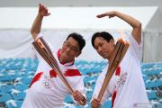 Dua pelari estafet pembawa api obor berpose sejenak di sela sela acara penyalaan obor, setelah estafet di jalan umum dibatalkan karena pandemi coronavirus (COVID-19), dalam acara estafet obor Olimpiade Tokyo 2020, di Yokohama , Prefektur Kanagawa, Jepang, Rabu (30/6/2021). ANTARA FOTO/Reuters-Kim Kyung-Hoon/hp.