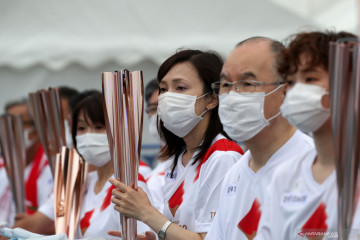 Para pelari estafet pembawa berpose sejenak di sela sela acara penyalaan obor, setelah estafet di jalan umum dibatalkan karena pandemi coronavirus (COVID-19), dalam acara estafet obor Olimpiade Tokyo 2020, di Yokohama , Prefektur Kanagawa, Jepang, Rabu (30/6/2021). ANTARA FOTO/Reuters-Kim Kyung-Hoon/hp.