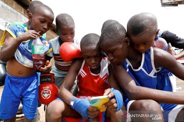 Petinju anak melihat video usai latihan di sasana tinju, taman Adura, Lagos, Nigeria, 5 Juni 2021. ANTARA FOTO/REUTERS/Temilade Adelaja/pras.