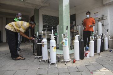 Sejumlah warga menaruh tabung oksigen saat mengantre isi ulang tabung oksigen di Depok, Jawa Barat, Senin (5/7/2021). Kasus COVID-19 yang melonjak tinggi di Kota Depok tersebut berimbas pada melonjaknya kebutuhan oksigen hingga 100 persen. ANTARA FOTO/Asprilla Dwi Adha/foc.