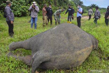 Petugas mengamati bangkai seekor gajah Sumatra (Elephas Maximus sumatrensis) yang mati dibunuh di kawasan perkebunan sawit milik PT Bumi Flora di Desa Jambo Reuhat, Kecamatan Banda Alam, Kabupaten Aceh Timur, Aceh. Senin (12/7/2021). Gajah berjenis kelamin jantan yang diperkirakan berusia 12 tahun tersebut ditemukan mati tanpa kepala. ANTARA FOTO/Hayaturrahmah/wsj.