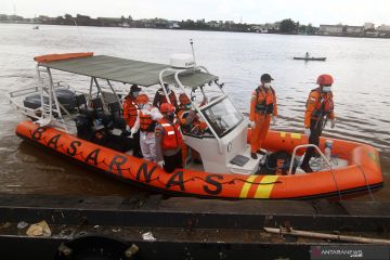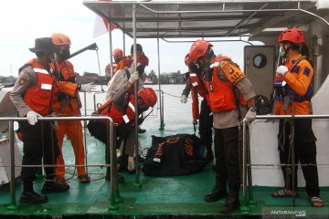 Sebuah kapal yang membawa satu kantong jenazah awak kapal yang berhasil ditemukan tiba di dermaga Pelabuhan Kantor Kesyahbandaran dan Otoritas Pelabuhan Pontianak, Kalimantan Barat, Jumat (16/7/2021). Berdasarkan data dari Kantor Search dan Rescue (SAR) Pontianak per Jumat (16/7/2021) pukul 18.00 WIB tersebut terdapat 77 awak kapal yang selamat, 10 orang meninggal dunia dan 44 orang masih dalam pencarian atas peristiwa kecelakaan 16 kapal yang tenggelam akibat cuaca buruk di Perairan Kalimantan Barat pada Selasa (13/7/2021) malam dan Rabu (14/7/2021) pagi. ANTARA FOTO/Jessica Helena Wuysang/wsj.