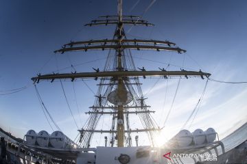 Taruna Akademi Angkatan Laut (AAL) Tingkat III Angkatan ke-68 menaiki tangga tiang layar saat latihan "parade roll" di atas KRI Bima Suci di Dermaga Armada II, Surabaya, Jawa Timur, Selasa (20/7/2021). Latihan tersebut bertujuan mempersiapkan taruna untuk melakukan parade roll yakni penghormatan ketika KRI bersandar atau bertolak di setiap wilayah yang dikunjungi. ANTARA FOTO/Muhammad Adimaja/rwa.