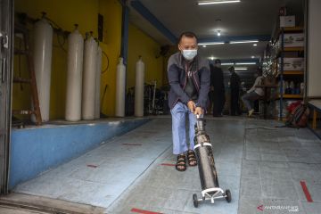 Pekerja bersiap mengisi tabung oksigen medis di agen isi ulang oksigen Fauzi Medical, Matraman, Jakarta Timur, Kamis (22/7/2021). Sebagai bentuk kepedulian terhadap sesama di tengah pandemi COVID-19, agen isi ulang tersebut menerapkan sistem pembayaran secara sukarela bagi para warga yang melakukan isi ulang oksigen. ANTARA FOTO/Aprillio Akbar/foc.