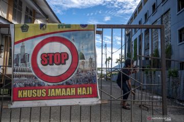 Pekerja memasang pagar barikade di jalan menuju gedung Asrama Haji Transit di Palu, Sulawesi Tengah, Jumat (23/7/2021). Pemerintah setempat akan mengalihfungsikan asrama haji tersebut menjadi rumah sakit darurat penanganan COVID-19 menyusul kenaikan kasus positif di wilayah itu lebih dari 200 persen sejak Juli 2021. ANTARAFOTO/Basri Marzuki/foc.