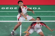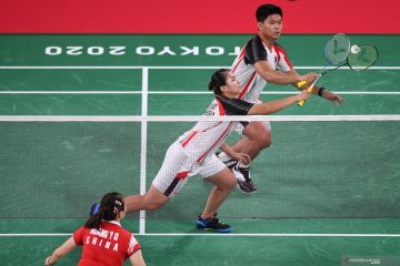 Ganda campuran Indonesia Praveen Jordan/Melati Daeva Oktavianti mengembalikan kok ke arah ganda campuran China Si Wei Zheng/Ya Qiong Huang dalam perempat final Olimpiade Tokyo 2020 di Musashino Forest Sport Plaza, Tokyo, Jepang, Rabu (28/7/2021). ANTARA FOTO/Sigid Kurniawan/foc.