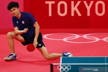 Petenis meja tunggal putra Taiwan Lin Yun-Ju (kiri) terlihat gembira setelah berhasil meraih poin saat melawan petenis meja putra China Fan Zhendong dalam laga semi final tunggal putrra tenis meja Olimpiade Tokyo 2020, di Tokyo Metropolitan Gymnasium, Tokyo, Jepang, Kamis (29/7/2021). Fan Zhendong melaju ke babak final setelah mengalahka Lin Yun Ju 4-3 (6-11, 11-9, 14-12, 13-15, 11-9, 9-11, dan 11-8), ANTARA FOTO/Reuters-Luisa Gonzalez/hp.