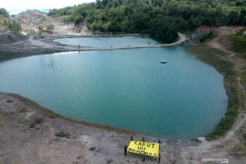 Sejumlah pengabdi bantuan hukum (PBH) LBH Padang, melakukan aksi guna menuntut pencabutan UU Minerba di kawasan lubang tambang batubara di Talawi, Sawahlunto, Sumatera Barat, Kamis (29/7/2021). Aksi tersebut digelar untuk mendukung Hak Uji Materil Undang-undang Mineral dan Batubara (UU-Minerba) ke Mahkamah Konstitusi yang dilakukan YLBHI, Jatam, LBH Bandung, LBH Padang, warga Banyuwangi dan warga Bangka Belitung, agar undang-undang tersebut dicabut karena dinilai sangat berdampak buruk terhadap lingkungan. ANTARA FOTO/Iggoy el Fitra/foc.