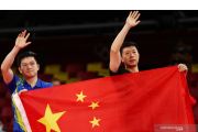 Petenis meja China Ma Long (kanan) dan rekannya Fan Zhendonmg (kiri) melambaikan tangan ke arah penonton seraya memegang bendera negaranya seusai mereka bertanding dalam babak final tunggal putra Tenis Meja Olimpiade Tokyo 2020, di Tokyo Metropolitan Gymnasium, Tokyo, Jepang, Jumat (30/7/2021). Ma Long berhasil meraih medali emas setelah mengalahkan Fan Zhendong 4-2 (11-4, 10-12, 11-8, 11-0, 3-11, dan 11-7). ANTARA FOTO/Reuters-Thomas Peter/hp.