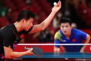 Petenis meja China Ma Long melakukan service bola ke arah lawannya yang juga rekan senegaranya Fan Zhendong dalam laga final tinggal putra Olimpiade Tokyo 2020, di Tokyo Metropolitan Gymnasium, Tokyo, Jepang, Jumat (30/7/2021). Ma Long berhasil meraih medali emas setelah mengalahkan Fan Zhendong 4-2 (11-4, 10-12, 11-8, 11-0, 3-11, dan 11-7). ANTARA FOTO/Reuters-Thomas Peter/hp.