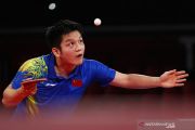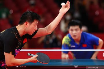Petenis meja China Ma Long melakukan service bola ke arah lawannya yang juga rekan senegaranya Fan Zhendong dalam laga final tinggal putra Olimpiade Tokyo 2020, di Tokyo Metropolitan Gymnasium, Tokyo, Jepang, Jumat (30/7/2021). Ma Long berhasil meraih medali emas setelah mengalahkan Fan Zhendong 4-2 (11-4, 10-12, 11-8, 11-0, 3-11, dan 11-7). ANTARA FOTO/Reuters-Luisa Gonzalezr/hp.