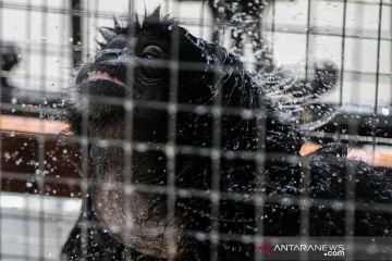 Seekor Siamang atau Kera Hitam (Symphalangus syndactylus) mengeringkan badannya usai dimandikan di kandang penangkaran kantor Resor 11 Balai Konservasi Sumber Daya Alam (BKSDA) 11 Aceh Utara, Aceh, Kamis (5/8/2021). BKSDA 11 Aceh Utara menerima satwa dilindungi berjenis kelamin jantan berusia empat tahun tersebut dari warga di Kabupaten Bireuen yang secara sukarela menyerahkan untuk direhabilitasi dan dilepasliarkan ke habitatnya. ANTARA FOTO/Rahmad/rwa.