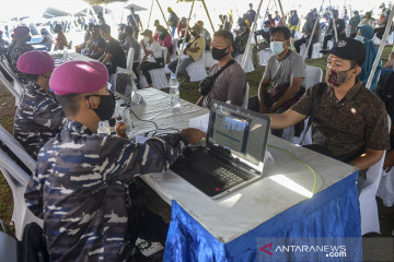 Prajurit Korps Marinir TNI AL melakukan pendataan ulang pada warga sekitar yang akan melakukan vaksinasi COVID-19 dosis kedua dalam 'Serbuan Vaksinasi COVID-19' di Kesatrian Marinir Baroto Sardadi, Marunda, Jakarta Utara, Sabtu (7/8/2021). Korps Marinir TNI AL menyiapkan 3.000 dosis vaksin COVID-19 bagi masyarakat sekitar guna mendukung percepatan pencapaian program pemerintah untuk membentuk kekebalan komunal. ANTARA FOTO/M Risyal Hidayat/aww.