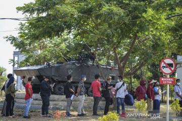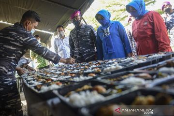 Komandan Korps Marinir (Dankormar) Mayjen TNI (Mar) Suhartono (tengah) mengamati hidangan makan yang akan diberikan pada warga yang telah mendapatkan vaksin COVID-19 dosis kedua dalam 'Serbuan Vaksinasi COVID-19' di Kesatrian Marinir Baroto Sardadi, Marunda, Jakarta Utara, Sabtu (7/8/2021). Korps Marinir TNI AL menyiapkan 3.000 dosis vaksin COVID-19 bagi masyarakat sekitar guna mendukung percepatan pencapaian program pemerintah untuk membentuk kekebalan komunal. ANTARA FOTO/M Risyal Hidayat/aww.