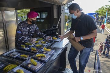 Prajurit Korps Marinir TNI AL memberikan hidangan makan pada warga sekitar usai melakukan vaksinasi COVID-19 dosis kedua dalam 'Serbuan Vaksinasi COVID-19' di Kesatrian Marinir Baroto Sardadi, Marunda, Jakarta Utara, Sabtu (7/8/2021). Korps Marinir TNI AL menyiapkan 3.000 dosis vaksin COVID-19 bagi masyarakat sekitar guna mendukung percepatan pencapaian program pemerintah untuk membentuk kekebalan komunal. ANTARA FOTO/M Risyal Hidayat/aww.
