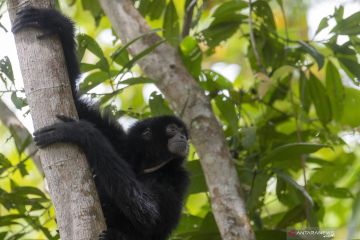 Seekor Siamang atau Kera Hitam (Symphalangus syndactylus) memanjat pohon usai dilepasliarkan di kawasan Suaka Margasatwa (SM) Dangku, Musi Banyuasin (Muba), Sumatera Selatan, Senin (9/8/2021). Dalam rangka memperingati Hari Konservasi Alam Nasional (HKAN) BKSDA Sumatera Selatan melepasliarkan tiga ekor Siamang yang sebelumnya telah menjalani proses rehabilitasi. ANTARA FOTO/Nova Wahyudi/wsj.