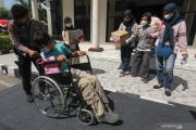 Polisi mendorong kursi roda penyandang disabilitas yang telah divaksin COVID-19 di Polda Jawa Timur, Surabaya, Jawa Timur, Selasa (10/8/2021). Polda Jawa Timur dan Polres jajaran menggelar vaksinasi COVID-19 bagi penyandang disabilitas dan Orang Dengan Gangguan Jiwa (ODGJ) dengan target 5.000 penerima vaksin guna mewujudkan kekebalan kelompok. ANTARA FOTO/Didik Suhartono/hp.