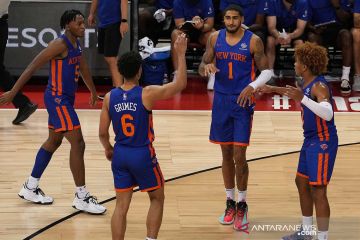 Pemain New York Knicks Obi Toppin (1) merayakan poin dengan rekannya Elfrid Payton (6), Miles McBride (2), Immanuel Quickley (5) saat laga NBA Summer League melawan LA Lakers di Thomas & Mack Center, Las Vegas, Nevada, AS (11/8/2021). Knicks menang dengan skor 111-96. ANTARA FOTO/Stephen R. Sylvanie/aww.