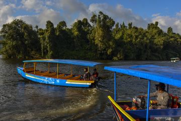 Pengelola jasa sewa perahu wisata menjemput wisatawan di Situ Lengkong, Panjalu, Kabupaten Ciamis, Jawa Barat, Kamis (12/8/2021). Kementerian Pariwisata dan Ekonomi Kreatif akan menggelontorkan dana hibah sebesar Rp2,4 triliun untuk para pelaku pariwisata dan ekonomi kreatif yang terdampak pandemi COVID-19. ANTARA FOTO/Adeng Bustomi/wsj.