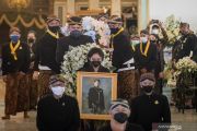 Keluarga dan kerabat Mangkunegaran membawa peti jenazah almarhum Kanjeng Gusti Pangeran Adipati Arya (KGPAA) Mangkunegara IX di Pura Mangkunegaran, Solo, Jawa Tengah, Minggu (15/8/2021). Raja Mangkunegaran almarhum KGPAA Mangkunegara IX dimakamkan di Astana Girilayu, Matesih, Karanganyar dan prosesi pemakaman dilangsungkan dengan adat Mataram Jawa. ANTARA FOTO/Mohammad Ayudha/foc.