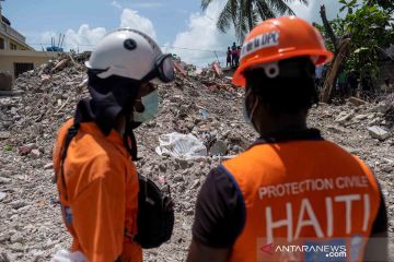 Dua orang personel SAR bersiap mengevakuasi korban meninggal dunia dari lokasi robohnya sebuah bangunan akibat gempa bumi berkekuatan 7,2 SR pada Sabtu lalu di Les Cayes, Haiti, Rabu (18/8/2021). ANTARA FOTO/REUTERS/Ricardo Arduengo/wsj.