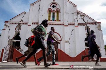 Sejumlah warga berlari melintas di depan bangunan gereja yang rusak akibat gempa bumi berkekuatan 7,2 SR pada Sabtu lalu di Les Cayes, Haiti, Rabu (18/8/2021). ANTARA FOTO/REUTERS/Ricardo Arduengo/wsj.