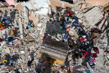 Orang-orang mencari harta bendanya dari lokasi bangunan yang runtuh akibat gempa bumi berkekuatan 7,2 SR pada Sabtu lalu di Les Cayes, Haiti, Rabu (18/8/2021). ANTARA FOTO/REUTERS/Ricardo Arduengo/wsj.