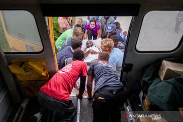 Relawan mengangkut korban gempa untuk dievakuasi menggunakan bus sekolah di Les Cayes, Haiti, Kamis (19/8/2021). Korban tewas akibat gempa tersebut dilaporkan mencapai dari 2.000 jiwa. ANTARA FOTO/REUTERS/Ricardo Arduengo/foc.