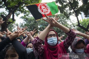 Seorang pencari suaka asal Afghanistan menangis saat berunjuk rasa di depan Kantor Komisi Tinggi PBB untuk Pengungsi (UNHCR), Kebon Sirih, Jakarta, Selasa (24/8/2021). Aksi menuntut kejelasan status penempatan pencari suaka di negara tujuan tersebut dibubarkan polisi karena memicu kerumunan di tengah pelaksanaan Pemberlakuan Pembatasan Kegiatan Masyarakat (PPKM). ANTARA FOTO/Aditya Pradana Putra/aww.