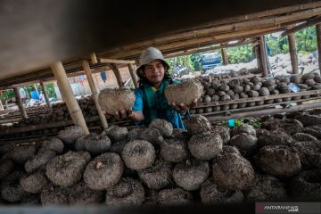 Petani menunjukkan umbi porang (Amorphophallus muelleri Blume) hasil panen di Kampung Jatiasih, Lebak, Banten, Kamis (26/8/2021). Kementerian Pertanian menyebut nilai ekspor porang pada tahun 2020 mencapai sebesar Rp923,6 miliar hingga menjadikan komoditas tersebut ditetapkan sebagai mahkota masuk dalam program gerakan tiga kali lipat ekspor (Gratieks). ANTARA FOTO/Muhammad Bagus Khoirunas/foc.