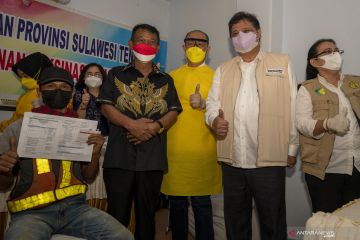 Ketua Komite Penanganan COVID-19 dan Pemulihan Ekonomi Nasional (KPCPEN) Airlangga Hartarto (kanan) menyaksikan vaksinasi COVID-19 yang dilaksanakan di halaman Kantor Gubernur Sulteng di Palu, Sulawesi Tengah, Jumat (27/8/2021). Airlangga Hartarto menekankan pentingnya perluasan dan percepatan pelaksanaan vaksinasi COVID-19 di Sulteng yang baru mencapai 17,48 persen dari target 2,1 juta jiwa agar tercipta kekebalan komunitas. ANTARA FOTO/Basri Marzuki/hp.