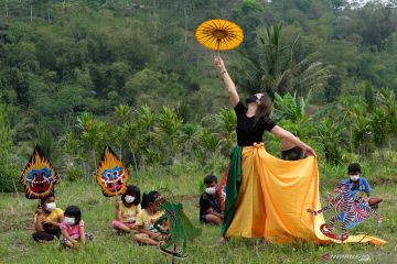 Seniman bersama anak-anak mengikuti kirab sambil membawa wayang saat Festival Lima Gunung (FLG) XX di Dusun Sudimoro, Baleagung, Grabag, Magelang, Jateng, Minggu (29/8/2021). Pementasan seni dalam rangkaian Festival Lima Gunung kali ini mengusung tema "2021 Peradaban Dari Desa" yang digelar terbatas dan tanpa penonton. ANTARA FOTO/Anis Efizudin/hp.