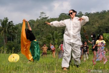 Seniman menampilkan tarian Peradaban Desa saat Festival Lima Gunung (FLG) XX di tengah persawahan Dusun Sudimoro, Baleagung, Grabag, Magelang, Jateng, Minggu (29/8/2021). Pementasan seni dalam rangkaian Festival Lima Gunung kali ini mengusung tema "2021 Peradaban Dari Desa" yang digelar terbatas dan tanpa penonton. ANTARA FOTO/Anis Efizudin/hp.