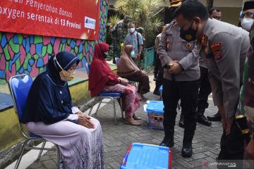 Kapolda Banten Irjen Pol Rudi Heriyanto (kanan) didampingi Wakapolda Brigjen Pol Ery Nursatari (kedua kanan) berdialog dengan warga lanjut usia saat penyerahan bantuan paket sembako untuk warga terdampak COVID-19 di Serang, Banten, Jumat (3/9/2021). Acara tersebut berlangsung saat Bakti Sosial Akademi Kepolisian Batalion Patriatama angkatan 1995 dengan membagikan 5.000 paket sembako dan 3.000 voucher belanja kepada warga terdampak pandemi. ANTARA FOTO/Asep Fathulrahman/hp.
