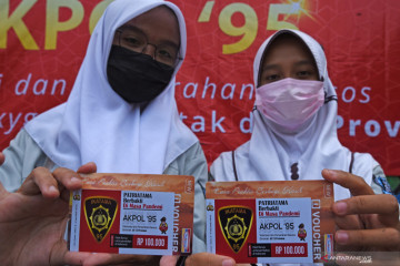 Pelajar menunjukkan kartu voucher untuk belanja usai penyerahan bantuan paket sembako untuk warga terdampak COVID-19 di Serang, Banten, Jumat (3/9/2021). Acara tersebut berlangsung saat Bakti Sosial Akademi Kepolisian Batalion Patriatama angkatan 1995 dengan membagikan 5.000 paket sembako dan 3.000 voucher belanja kepada warga terdampak pandemi. ANTARA FOTO/Asep Fathulrahman/hp.