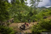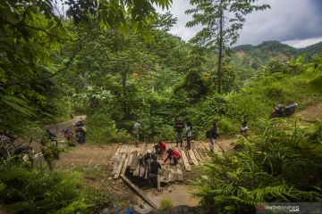 Sejumlah warga bersama anggota Posko Meratus memperbaiki salah satu jembatan penghubung antar desa dengan swadaya di Desa Datar Ajab, Kabupaten Hulu Sungai Tengah, Kalimantan Selatan, Sabtu (4/9/2021). Menurut keterangan warga setempat, jembatan yang menjadi akses jalan satu-satunya bagi warga Desa Datar Ajab itu sudah hampir 10 tahun ini kondisinya sangat memprihatinkan sehingga membahayakan warga yang melintas. ANTARA FOTO/Bayu Pratama S/foc.