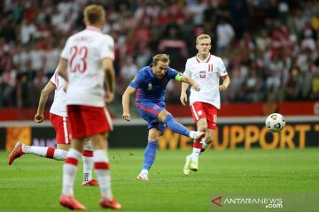 Pesepakbola Inggris Harry Kane mencetak gol saat menghadapi Polandia pada kualifikasi Piala Dunia 2022 di PGE Narodowy, Warsawa, Polandia, Kamis (9/9/2021). Inggris ditahan imbang Polandia 1-1. ANTARA FOTO/Action Images via Reuters/Carl Recine/rwa.