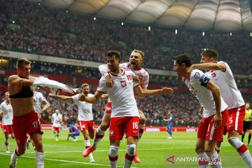 Pesepakbola Polandia Damian Szymanski merayakan gol saat menghadapi Inggris pada kualifikasi Piala Dunia 2022 di PGE Narodowy, Warsawa, Polandia, Kamis (9/9/2021). Inggris ditahan imbang Polandia 1-1. ANTARA FOTO/REUTERS/Kacper Pempel/rwa.